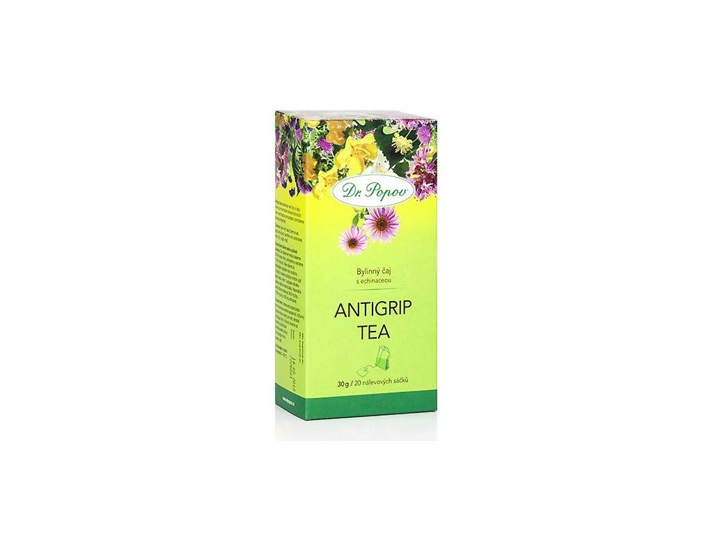 Bylinný čaj Dr. Popova Antigrip tea podporuje správné fungování dýchacích cest a to díky obsahu lípy a bezu černého. Zároveň pomáhá posilovat přirozenou obranyschopnost, protože obsahuje echinaceu (třapatku). Čaj proto doporučujeme pít v období, kdy hrozí snížená imunita (např. při virózách).