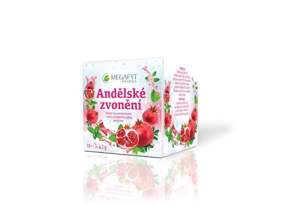 Megafyt Andělské zvonění je ovocný čaj porcovaný, aromatizovaný s chutí granátového jablka. Obsahuje jablko, ibišek, růži šípkovou, ostružiník, přírodní aroma granátového jablka, mátu a přírodní aroma máty.