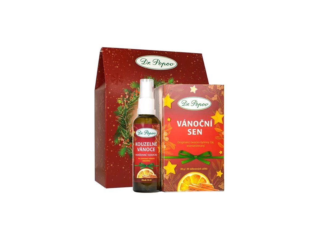 Dárková kazeta obsahuje osvěžovač vzduchu KOUZELNÉ VÁNOCE a lahodný ovocno-bylinný čaj Vánoční sen.
