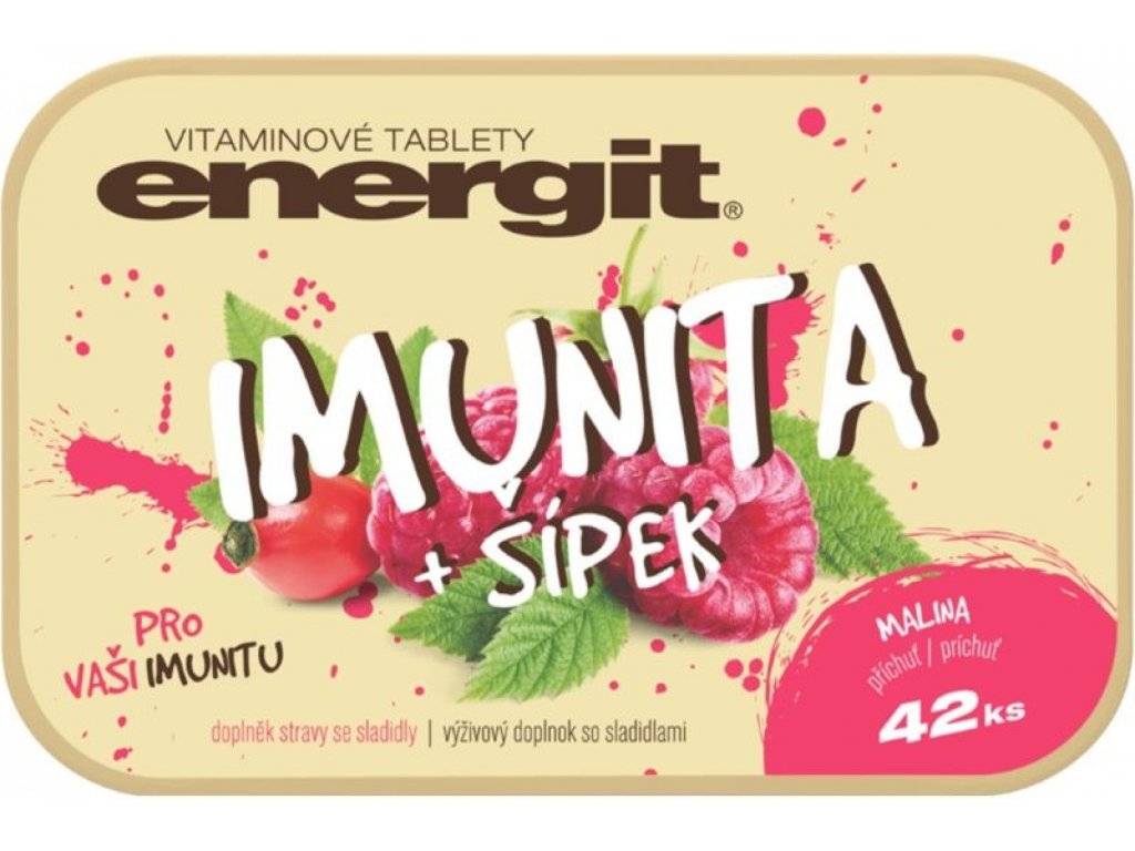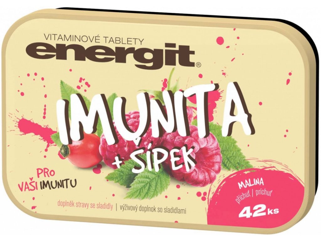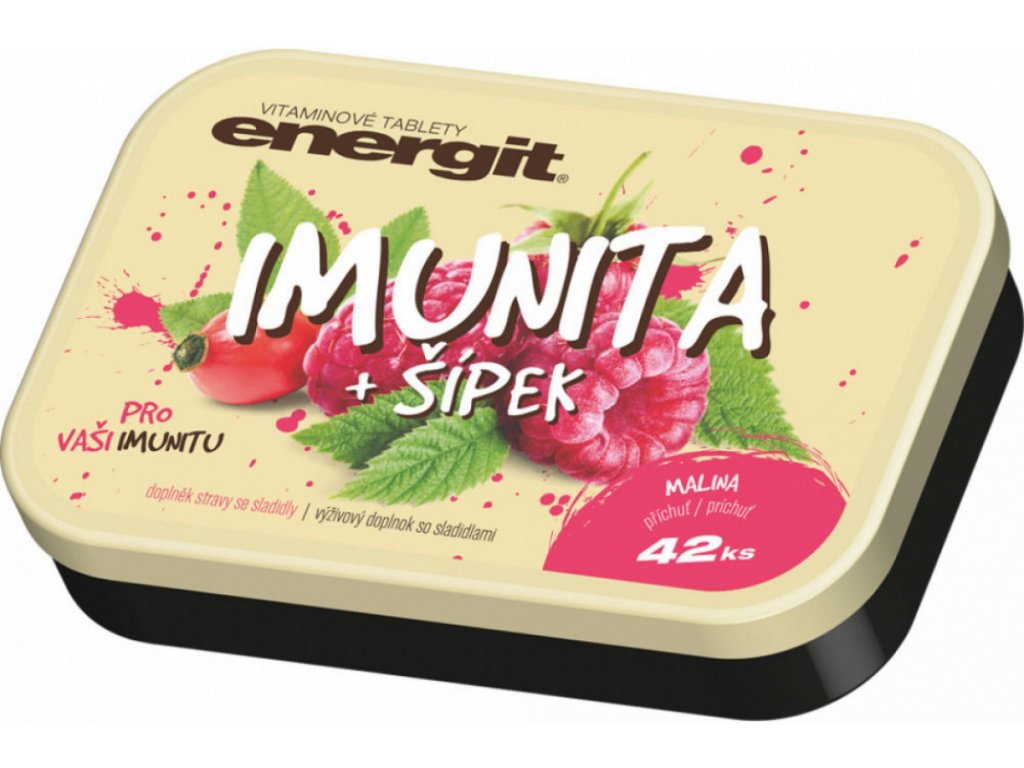Doplněk stravy Energit Imunita jsou tablety s lahodnou malinovou příchutí s obsahem vitaminu C, zinku a extraktu ze šípku.